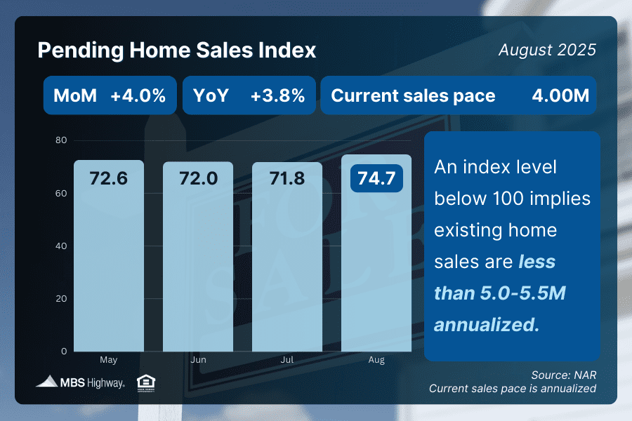 There’s good news for housing activity: Pending home sales rose 4% in August from July and are up nearly 4% year-over-year. This rebound came as mortgage rates began to trend lower toward the end of summer.